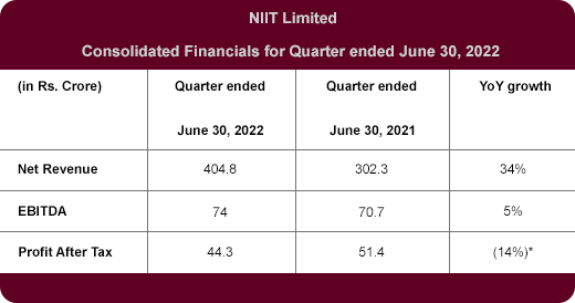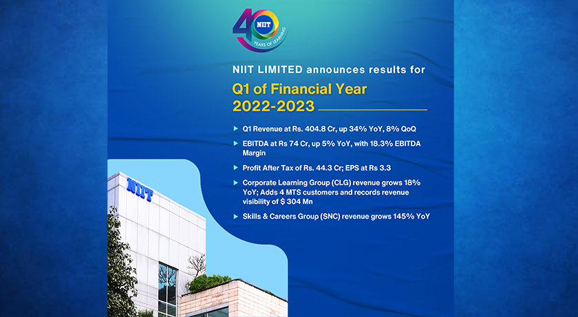 NIIT Limited (NSE: NIITLTD), a leading global talent development corporation, today reported the results for its first quarter ending June 30, 2022. During the quarter, the company recorded Net Revenue of Rs. 404.8 Cr, up 34% YoY and 8% QoQ. EBITDA was Rs. 74 Cr, up 5% YoY and the EBITDA margin stood at 18.3%. Profit After Tax was recorded at Rs. 44.3 Cr. EPS stood at Rs 3.3.