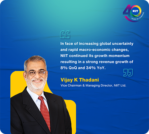 | “In face of increasing global uncertainty and rapid macro-economic changes, NIIT continued its growth momentum resulting in a strong revenue growth of 8% QoQ and 34% YoY.” |