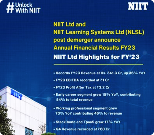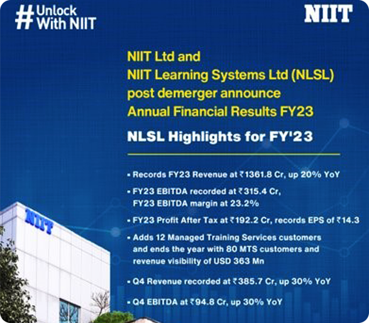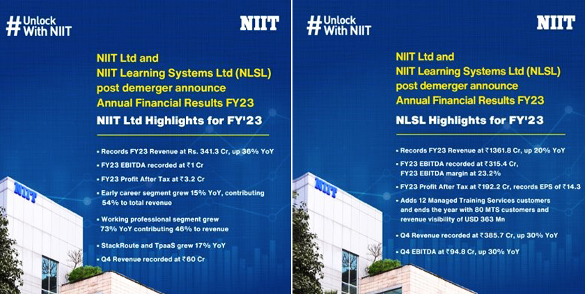 NIIT Ltd and NIIT Learning Systems Ltd (NLSL) announced annual results for FY23 . This follows the strategic demerger announcement by NIIT, which has led to the establishment of two distinct entities—NIIT Ltd and NLSL.