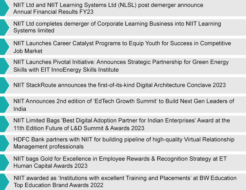 | NIIT awarded as ‘Institutions with excellent Training and Placements’ at BW Education Top Education Brand Awards 2022 |