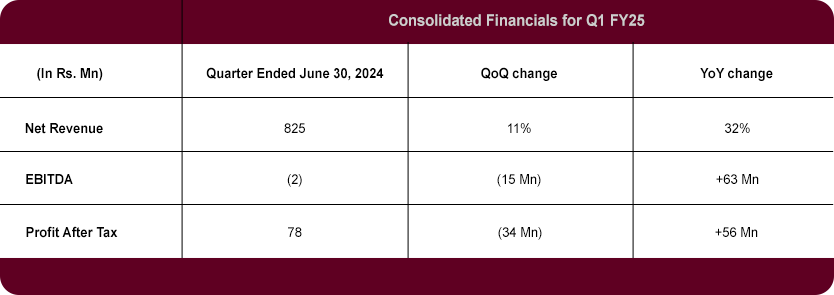 During the quarter, the company recorded Net Revenue of Rs. 825 million, up 32% YoY and up 11% QoQ. EBITDA margin was near breakeven vs negative 10% in corresponding quarter last year. Profit After Tax was Rs. 78 million as compared to Rs. 22 million in Q1 FY24.
