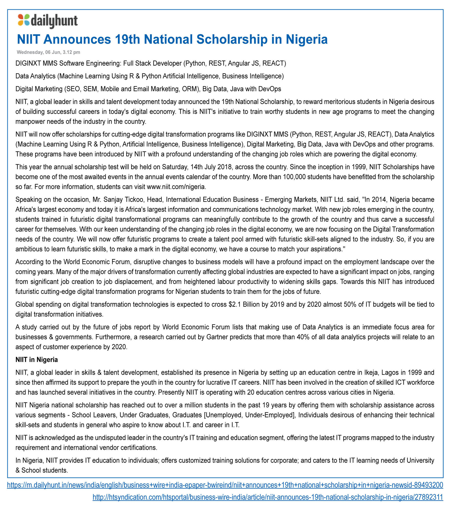 - NIIT announced 19th National Scholarship in Nigeria to reward meritorious students in Nigeria desirous of building successful careers in today's digital economy