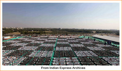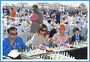 The venue layout of the record breaking event was a visual delight. The Gujarat University Grounds of Ahmedabad was turned into a giant Chess Board with 64 alternating black & white squares. The players were segregated equally within the squares which were either black or white, just as in a Chess Board. The imposing 29,000 square meters of Chess Board, created through perfect colour coordination could be viewed even from the air.